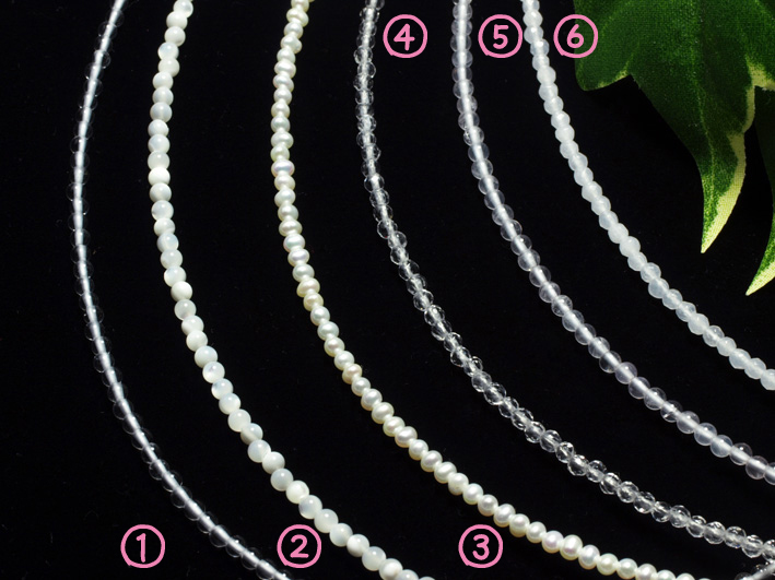 NEW ①ご注文番号 272-1 水晶ネックレス 水晶2mm玉 約42cm シルバー925金具使用 6,000円(+消費税) コーディネートするときにも主張しないシンプルで、 美しい水晶の丸玉を使用いたしましたネックレスです。 ②ご注文番号 272-10 マザーオブパール(ホワイト)ネックレス マザーオブパール(ホワイト)2mm玉 約43cm シルバー925金具使用 5,000円(+消費税) マザーオブパールを使用した 丸くてカワイイネックレスです。白の中にも乳白色と白のマーブル模様がとても美しいです。 ③ご注文番号 272-6 淡水パールネックレス 淡水パール2mm玉 約41cm シルバー925金具使用 2mmの淡水パールです。 とても清楚でかわいいイメージのパールです。2mmという大きさは大きな玉よりも貴重なサイズなのです。 女性にとっての良い影響ばかりのパール。おすすめです。 ④ご注文番号 272-2 水晶カットネックレス 水晶2mm玉カット 約42cm シルバー925金具使用 7,000円(+消費税) 透明の水晶をカットして あるために、キラキラ光を放ちます。どんな石とも相性がよく石の効果をさらに高めてくれるでしょう。 2mm玉をカットすることは想像を超えた技術を持つ職人の手によるものです。 ⑤ご注文番号 272-8 ローズクオーツネックレス ローズクオーツ2mm玉 約42cm シルバー925金具使用 6,000円(+消費税) ほのかにピンクが 感じられるローズクオーツ。とても優しい印象です。 ⑥ご注文番号 272-3 スノークオーツカットネックレス スノークオ-ツ(水晶)2mm玉カット 約42cm シルバー925金具使用 7,000円(+消費税) スノークオーツは水晶の乳白色のものです。水晶と効果は同じく浄化や他の石のパワーを高めます。 かわいく優しい乳白色にカットが施された魅力的なお品です。 ※画像にマウスをあてますと、大きなサイズで商品をご覧いただけます。 |