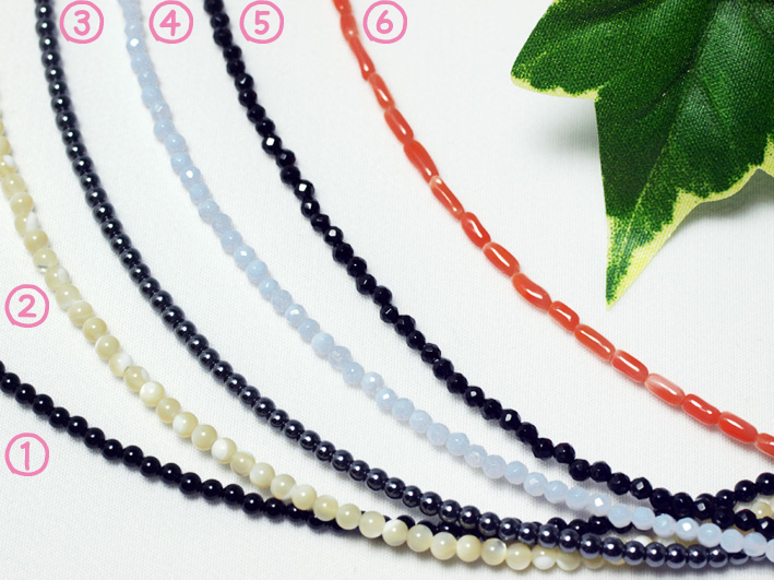 邪悪なものを寄せ付けないパワーと運動能力をアップすることでも有名なオニキス。 スポーツ選手などがよく身につけられていますね。黒という色がおしゃれです。 ②ご注文番号 273-11 マザーオブパール(ベージュ)ネックレス マザーオブパール(ベージュ)2mm玉 約43cm シルバー925金具使用 5,000円(+消費税) マザーオブパールのベージュのタイプです。 ベージュのベースにシェル特有のひかりと白のマーブルがすてきです。色もベージュと肌なじみがよいお品です。 ③ご注文番号 273-9 ヘマタイトネックレス ヘマタイト2mm玉 約43cm シルバー925金具使用 守護力をアップしたり、生命力を高め、 勝利へ導くというヘマタイト。血液の流れを良くする効果もあるようで、肩こりでお困りの方にとても人気があります。 ④ご注文番号 273-7 ブルーレースアゲートネックレス ブルーレースアゲート2mm玉カット 約43cm シルバー925金具使用 魂の浄化や、交友関係を良くする と言われるブルーレースアゲート。さわやかな印象とやさしいブルーがカットの光によりさらに美しいお品です。 ⑤ご注文番号 273-5 オニキスカットネックレス オニキス2mm玉カット 約43cm シルバー925金具使用 7,000円(+消費税) オニキスのカットの ご紹介です。邪悪なものを寄せ付けず、霊的防御力のあるオニキス。お守りに最適なおしゃれなお品です。 ⑥ご注文番号 273-12 ピンクさんご(コーラル)ネックレス ピンクさんご(天然色)2mm×3~5mm 約43cm シルバー925金具使用 8,000円(+消費税) 天然色の珊瑚のご紹介です。ストレスを解消したり、解毒作用があったり子宝や幸せな結婚などの 多くの意味を持つ珊瑚。かわいい色もポイントになり、大人気です。 |