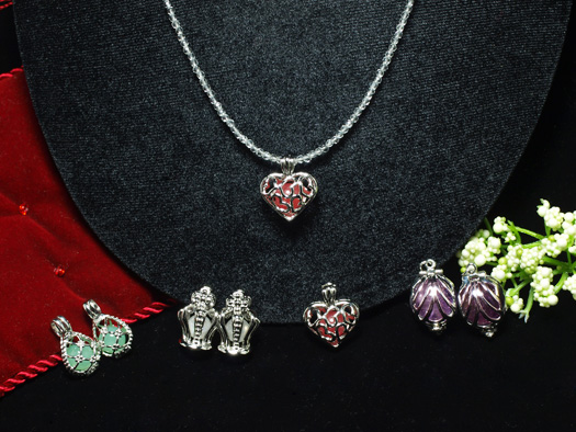 NEW ご注文番号 291 ハート型ペンダントトップ 約1.8×1.6×1.0cm シルバー925金具使用 5,000円(+消費税) ハート型の開閉ができるペンダントトップです。約7.5mmまでの丸玉が入ります。 こちらには、7.5mmのインカローズをお付けしてのお届けとなります。 ※画像にマウスをあてますと、大きなサイズで商品をご覧いただけます。 |