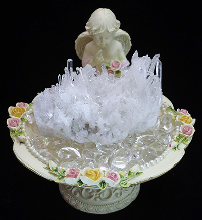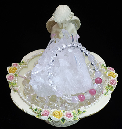 この水晶のクラスターに 上質なさざれ水晶と、クラスターの放つ波長のイメージにピッタリの天使のトレーを合わせてみました。