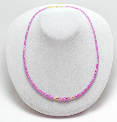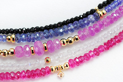 今回ご紹介するサファイアは、淡いピンクが美しい石をネックレス用に 中央にK18パーツと大きめの石を配しグラデーションでご用意させていただきました。