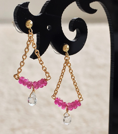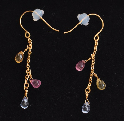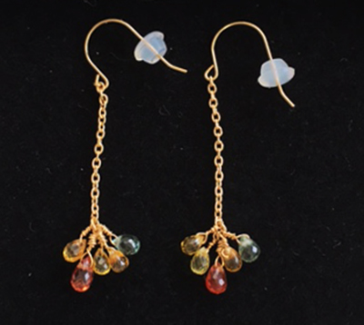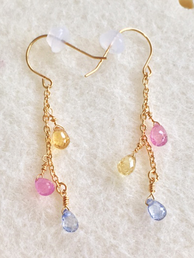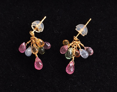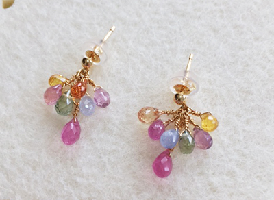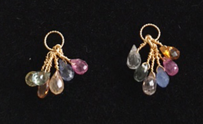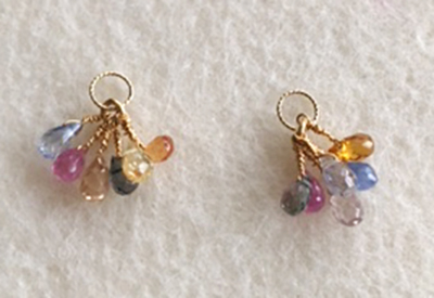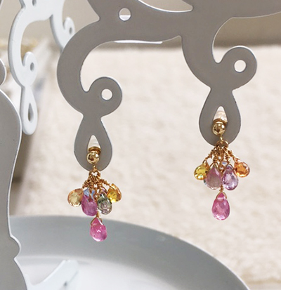 【K18 マルチカラーサファイアのプチチャーム】(2個 1セット) ご注文番号 545 18,000円 (+消費税) ※画像にマウスをあてますと、大きなサイズで商品をご覧いただけます。 ☆いろんなカラーのサファイアを贅沢に房にしてご用意したチャームです。 サファイアの大きさやカラーは、ナチュラルな原石を研磨していますので それぞれに多少の違いがあります。 サファイアのカットは ブリオレットカットです。 ペアシェイプカットのように 厚みがある面と うすい面が出てしまわないで 綺麗な雫形になるよう 丁寧にカットをつけて どこから見ても 色と形と輝きが楽しめるブリオレットカットのルースを使用しています。 サファイアの1粒の大きさは、縦が約3㎜から4㎜ 横幅が約2㎜から3㎜の粒です。 房状に連ねてあるので、動く度に いろんなカラーが顔を覗かせてくれます。 片側に6粒ずつ 両方で合計12粒のサファイアをお楽しみいただけます。 上部のヨリ線の輪[ロープのようなテクスチャー]は、直径約4㎜で 全長は約1、4㎝です。 サファイアのカラーは、ブルー、イエロー、オレンジ、ピンク、グリーン、クリアー、ライトパープル等を 可愛らしくバランスを見て組み合わせてあります。 いろんなカラーを楽しんでくださいね! 使用しているゴールドカラーのパーツは全てK18イエローゴールド素材です。 |