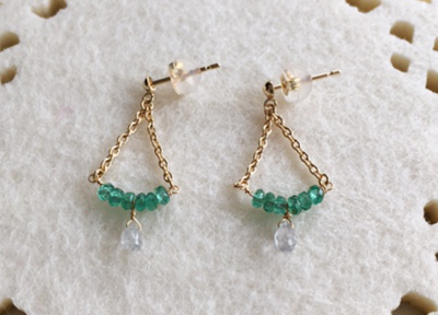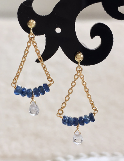 【K10 ブルーアパタイト アメリカンピアス】(ペア1組) ご注文番号 552 10,000円 (+消費税) ※画像にマウスをあてますと、大きなサイズで商品をご覧いただけます。 ・K10イエローゴールド アメリカンカーブピアス ・カーブしたピンの長さ 約3㎝ ・チェーンの長さ 約5㎝ ・K10イエローゴールド マルカン使用 ・チャーム部分の長さ(ブルーアパタイト) 約2㎝ ・全体の長さ 約10㎝ ☆アパタイトの石を使ったチャームのご紹介です。 アパタイトが こうしてビーズやルースになってご用意できることは なかなか難しいことなのです。 美しい素材が少なかったり 形成したり磨きをかける時に加工が難しく ロスが出てしまうこともあるからです。 美しいビーズになれる割合が限られているので稀少な素材とも言えます。 装飾に用いられるアパタイトは、グリーンからブルーの色味が多いです。 今回ご用意しているアパタイトは、グリーンとブルーが合わさったような 程好いグリーンブルーカラーです。 他の石にはあまり見られない色を持っています。 石のお好きな方でしたら エメラルドでも無く アクアマリンでも無いし… 何の石かなぁ?と興味を持っていただける素敵なカラーです。 |