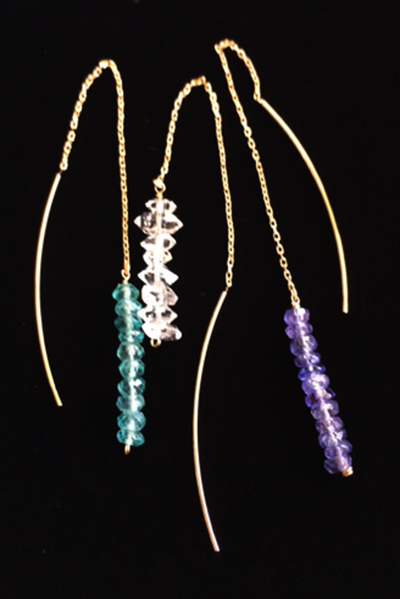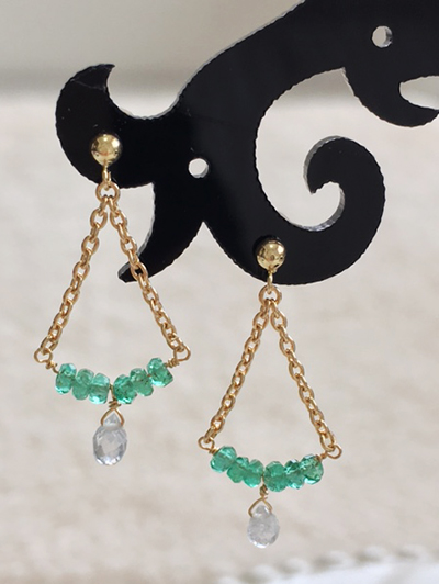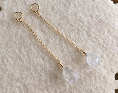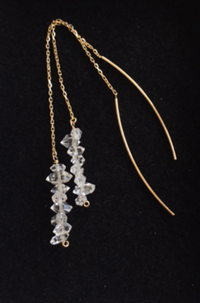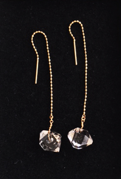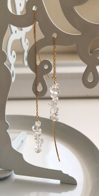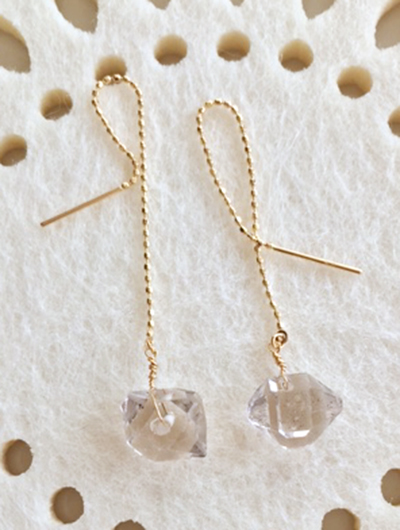 【K10 ハーキマーダイヤクォーツ アメリカンピアス】(ペア1組) ご注文番号 549 10,000円 (+消費税) ※画像にマウスをあてますと、大きなサイズで商品をご覧いただけます。 ・K10イエローゴールド アメリカンカーブピアス ・カーブしたピンの長さ 約3㎝ ・チェーンの長さ 約5㎝ ・チャーム部分の長さ(ハーキマーダイヤクォーツ) 約2㎝ ・全体の長さ 約10㎝ ・K10 イエローゴールド マルカン使用 ☆ニューヨーク州ハーキマー地方で採掘された ハーキマーダイヤクォーツです。 小さな粒を連ねてみました。 ハーキマーダイヤクォーツ特有の輝きと 両剣のナチュラルな形をお楽しみいただけます。 透明色とゴールドのシンプルな色合いが爽やかです。 |
