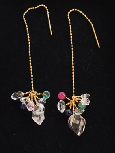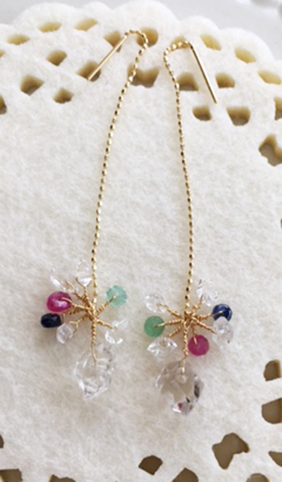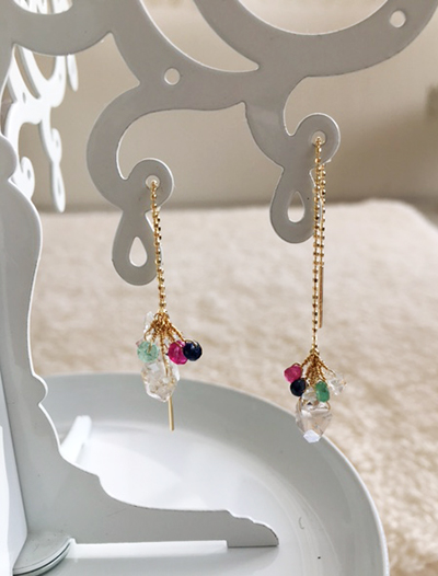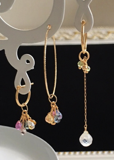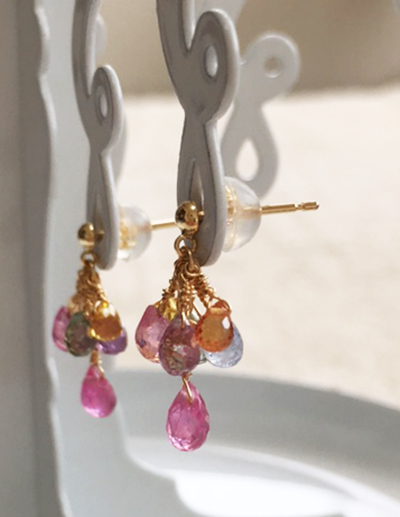 【K18 マルチカラーサファイア シャンデリアピアス】(ペア1組) ご注文番号 514 28,000円 (+消費税) ※画像にマウスをあてますと、大きなサイズで商品をご覧いただけます。 ◎[K18イヤリングパーツへ変更可能アイテムです]・イヤリングパーツ(K18イエローゴールド)への変更は、プラス¥6000(+消費税)で承ります。 ご注文フォーム備考欄に「イヤリングパーツへ変更希望」とご記入くださいませ。 ・K18イエローゴールド ピンポストピアス(K18シリコンカバー付きキャッチ) ・サファイアブリオレットカット 14石 ピンクサファイア大(約5㎜×3㎜) マルチカラーサファイア小(約3㎜×2㎜) ・K18イエローゴールド マルカン、金線使用 ・トップチャームの全長 約1、5㎝ ☆さまざまなカラーのブリオレットカットサファイアを ミニシャンデリアのように房状にして お顔の近くの耳元で楽しんでいただけているデザインです。 可愛らしくキャンディカラーになるよう色合わせをしています。 サファイアと聞くと、まずブルーやピンクを連想されると思いますが、サファイアには さまざまなカラーが存在します。 サファイアは、鉱物的には「コランダム」と言う種類で 赤いカラーのものはルビーです。 赤色以外のコランダムは サファイアとなる訳です。 同じコランダムでも それぞれが育まれる過程で どのようなイオンを含み、圧力や地熱に当たったのかの環境条件等で 色の違いが生まれるのです。 それぞれが色々な道を歩んできたサファイア達なのです。 この度チョイスした石は、ナチュラルカラーの淡く可愛らしい色を集めてみました。 色んなカラーのサファイアを楽しまれてくださいね。 メインには、少し大きめなピンクサファイアが下からのぞくように配置し、周りには 水色 グリーン オレンジ イエロー パープル ピンク等のブリオレットカットのサファイアをペアで合計14石使用しております。 とても貴重なナチュラルのマルチカラーサファイアを1粒ずつ丁寧にカットしたルースです。 人工加工のカラー調整をしていない為、カラーの濃淡に差が生じます。また、黒いインクルージョンを隠すための放射線処理や含浸処理もしていないナチュラルな石のため、インクルージョンやクラックの見られるルースも含まれる場合がございます。どうか御了承くださいませ。 ★{サファイア}★ 神からの祝福、邪悪なものを退ける、精神と肉体の浄化、幸運を呼び寄せる、などの意味を持つサファイアです。 [外から引き寄せる運] ・積徳運…ご先祖様や仏様から護られる。物事の全てから学びを得られる運 ・天財運…神様からの引き立てが強くなる運。勝負に勝ち 勘が鋭くなる運 |