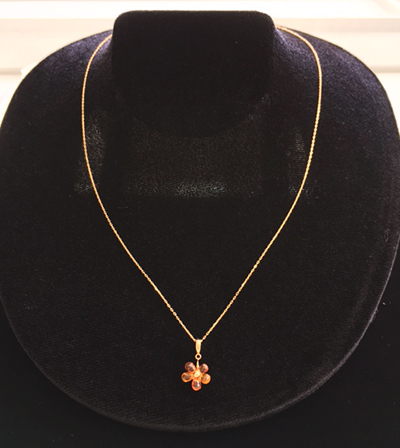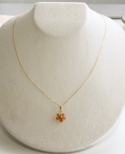 【K18 サファイアお花のネックレス】 ご注文番号 516 18,000円 (+消費税) ※画像にマウスをあてますと、大きなサイズで商品をご覧いただけます。 ・K18イエローゴールド ネックレスチェーン 40㎝(37㎝に調整できるアジャスター○カン付き) ・オレンジサファイアブリオレットカット 5石 (約4㎜×3㎜) ・K18イエローゴールドバチカン(5㎜×2㎜) ・K18イエローゴールド マルカン、金線使用 ・トップチャームの全長(バチカン含む) 約1、5㎝ |