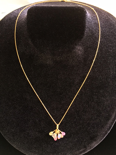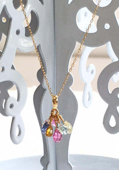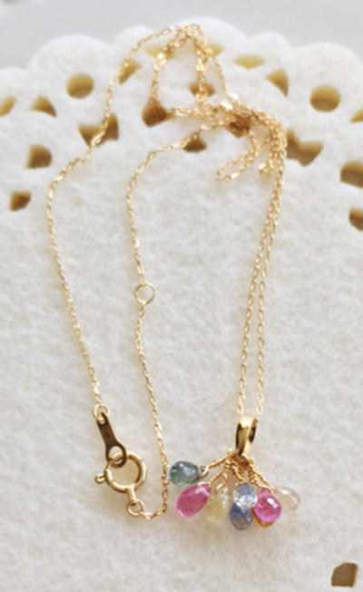 【K18 マルチカラーサファイアネックレス】 ご注文番号 519 21,000円 (+消費税) ※画像にマウスをあてますと、大きなサイズで商品をご覧いただけます。 ・K18イエローゴールド ネックレスチェーン 40㎝(37㎝に調整できるアジャスター○カン付き) ・カラーサファイアブリオレットカット 8石 (約4㎜×3㎜)(3㎜×2㎜) ・K18イエローゴールドバチカン(5㎜×2㎜) ・K18イエローゴールド ○カン、金線使用 ・トップチャームの全長(バチカン含む) 約1、5㎝ ☆サファイアのブリオレットを房状にしたペンダントトップのネックレスもご用意しました。 パステルカラーで可愛らしい色達を8石組み合わせています。 ピンク、ブルー、オレンジ、イエロー、グリーン、水色、シャンパンカラー等を合わせました。 風船の束のような 夢のあるカラーです。 首もとに可愛らしく揺らしてくださいね。 |