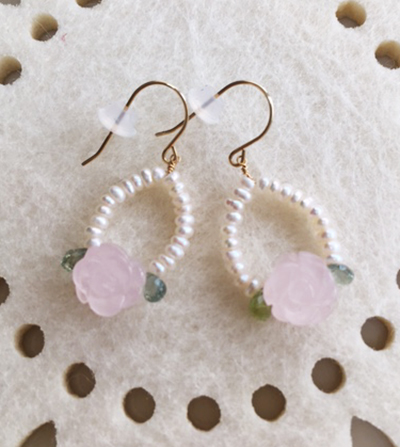 【K18 ローズと淡水パールのピアス】(ペア1組) ご注文番号 522 11,000円 (+消費税) ※画像にマウスをあてますと、大きなサイズで商品をご覧いただけます。 ◎[K18イヤリングパーツへ変更可能アイテムです]・イヤリングパーツ(K18イエローゴールド)への変更は、プラス¥8000(+消費税)で承ります。 ご注文フォーム備考欄に「イヤリングパーツへ変更希望」とご記入くださいませ。 ・K18イエローゴールド フックピアス(シリコンキャッチ付き) ・淡水パール 40粒(約2㎜×1㎜) ・ローズクォーツバラ彫り 2石(約8㎜) ・グリーンサファイア 4石(4㎜×3㎜) ・K18イエローゴールド 金線使用 ・トップチャームの全長 約2㎝ ☆優しいピンクのローズクォーツを 手彫りでバラのモチーフに型どったストーンを中央にし、バラの両脇に葉っぱを表した グリーンサファイア、小粒の淡水パールで囲んだデザインのピアスです。 名前の通り ローズのモチーフにしたローズクォーツが 可愛く揺れるピアスにしてみました。 |
