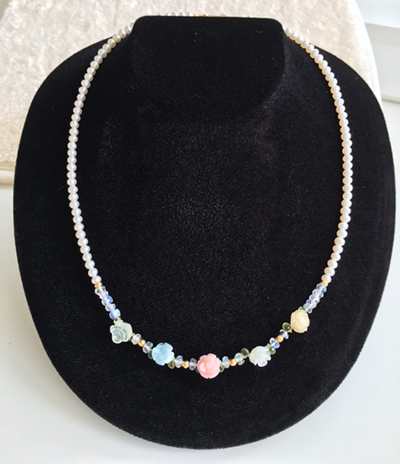 【K18 フラワーガーデン パールネックレス】 ご注文番号 523 27,000円 (+消費税) ※画像にマウスをあてますと、大きなサイズで商品をご覧いただけます。 ・K18金具 引き輪、プレート ・つぶし玉、コイル(ステンレスに金メッキ) ・淡水パール(4㎜×3㎜) ・バラ彫りフラワー (イエローカルサイト、ホワイトシェル、ピンクコモンオパール、アクアマリン、プレナイト)各 約8㎜ ・ホワイトラブラドライト ボタンカット 18石(約4㎜×3㎜) ・ペリドットブリオレット 10石(約2㎜×3㎜) ・K18ドーナッツビーズ 2粒(3㎜) ミラーボールビーズ 4粒(2、5㎜) ・ネックレス全長(金具を含めた長さ) 43㎝ ☆優しいカラーのフラワーモチーフのストーン達と、淡水パールやホワイトラブラドライトやペリドットやK18ビーズをさりげなく入れて 1本のネックレスの中に[バラ園]を表してみました。 フラワーパーツは 手彫りのバラのモチーフです。 黄色はイエローカルサイト、白はホワイトシェル(貝)、ピンクはピンクコモンオパール、ブルーはアクアマリン、グリーンはプレナイトです。 フラワーパーツの両脇には 葉っぱのようにブリオレットカットのペリドットを入れて カラーフラワー(バラ)の間には、バランスがとれるよう ホワイトラブラドライトやK18ビーズの輝く素材をさりげなく配しています。 全体を囲むのは 気品があり優しい印象の淡水パールです。 大人の女性がつけていただいても 可愛くなり過ぎずに素敵にお使いいただけますよ。 シャツ1枚のようなシンプルな装いにも タートルネックのお洋服などにも とても良く合い コーディネートに華を添えてくれます。 |