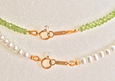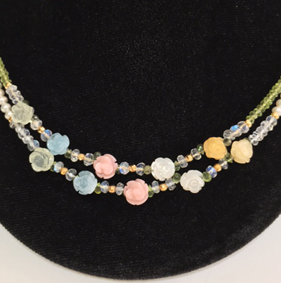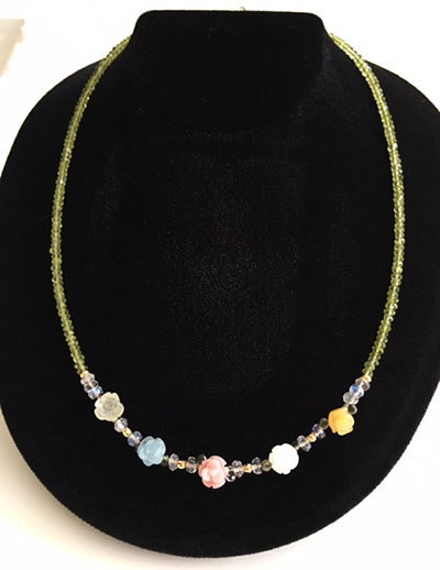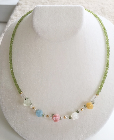 【K18 フラワーガーデン ペリドットネックレス】 ご注文番号 524 30,000円 (+消費税) ※画像にマウスをあてますと、大きなサイズで商品をご覧いただけます。 ・K18金具 引き輪、プレート ・つぶし玉、コイル(ステンレスに金メッキ) ・ペリドット(約3㎜×2㎜) ・バラ彫りフラワー (イエローカルサイト、ホワイトシェル、ピンクコモンオパール、アクアマリン、プレナイト)各 約8㎜ ・ホワイトラブラドライト ボタンカット 14石(約4㎜×3㎜) ・グリーンサファイアブリオレット 10石(約4㎜×3㎜) ・K18ドーナッツビーズ 2粒(3㎜) ミラーボールビーズ 4粒(2、5㎜) ・ネックレス全長(金具を含めた長さ) 43㎝ ☆優しいカラーのフラワーモチーフのストーン達と、ペリドットやホワイトラブラドライトやグリーンサファイアやK18ビーズをさりげなく入れて 1本のネックレスの中に[バラ園]を表してみました。 フラワーパーツは 手彫りのバラのモチーフです。 黄色はイエローカルサイト、白はホワイトシェル(貝)、ピンクはピンクコモンオパール、ブルーはアクアマリン、グリーンはプレナイトです。 フラワーパーツの両脇には 葉っぱのようにブリオレットカットのグリーンサファイアを入れて カラーフラワー(バラ)の間には、バランスがとれるよう ホワイトラブラドライトやK18ビーズの輝く素材をさりげなく配しています。 全体を囲むのは 若葉のような印象のペリドットです。 大人の女性がつけていただいても 可愛くなり過ぎずに素敵にお使いいただけますよ。 シャツ1枚のようなシンプルな装いにも タートルネックのお洋服などにも とても良く合い コーディネートに華を添えてくれます。 |