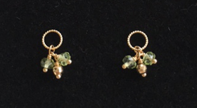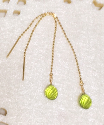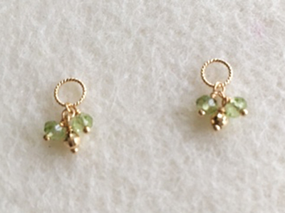【K18 ペリドットのプチチャーム】(2個 1セット) ご注文番号 541 7,800円 (+消費税) ※画像にマウスをあてますと、大きなサイズで商品をご覧いただけます。 ☆ペリドットは、横が約3㎜ 縦が約2㎜の繊細なボタンカットが施されています。 1つのパーツに ペリドットが2粒と、K18イエローゴールドのミラーボール2㎜が1つ付いて 3粒が可愛らしくぶら下がります。 上部のヨリ線の[ロープのようなテクスチャー]の輪の直径は4㎜です。 輪の上からチャームの下までの全長は約1㎝の大きさです。 フープピアスに付けていただくと 3粒のパーツが可愛く耳元で揺れます。 透明感のあるグリーンが爽やかなチャームです。 |