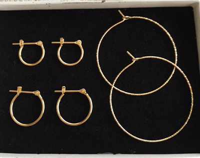 【K10 イエローゴールドイヤーフープ】(ペア1組) ご注文番号 554 5,000円 (+消費税) ※画像にマウスをあてますと、大きなサイズで商品をご覧いただけます。 ・K10イエローゴールド イヤーフープ(シリコンパーツ付き) ・フープの直径 約1㎝ ・線の直径 約0、8㎜ ☆ピアスホールが空いていない方に、ピアスをつけているようにも見えるイヤーフープです。 ピアスホールが空いている方にも もちろんお使いいただけます。 簡単に着けていただけるアイテムです。 使い方は、耳たぶに挟んでいただくだけで装着完了です。 耳のふちでしたら どこにでも着けていただけます。 ※それぞれ 耳たぶの厚みに違いがあると思います。ご自身の耳たぶに合わせて、少し力を入れて 挟み具合を調整してお着けいただくようになります。 お作りは とてもシンプルで、K10イエローゴールドのフープ状のものです。 お耳を挟んで前にくる先端部分には 丸い玉のデザインがついて お耳を挟んで裏側になる部分の端は、丸い玉が付かないでフープを切った状態になっています。(角はまるめてあります。こちら側からチャームを通せるようになっています。チャームを通したら、またシリコンキャッチカバーをつけてくださいね) そこに シリコンキャッチカバーをつけて 装着時の安定をはかり お耳に挟んでお着けいただく仕様です。 ※耳たぶに挟むだけの装着方法になるイヤーフープです。落としてしまうことがありませんよう 各自でご注意くださいませ。 ★イヤーフープに通してお使いいただけるチャームパーツを 今後増やしてご紹介していきたいと思っております。 |