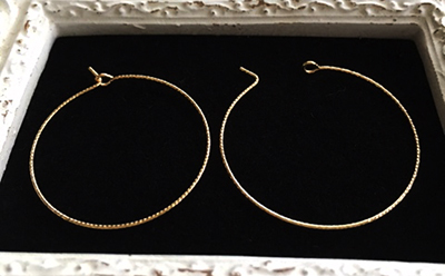 【K18 フープピアス】(直径30㎜、ペア1組) ご注文番号 537 16,000円 (+消費税) ※画像にマウスをあてますと、大きなサイズで商品をご覧いただけます。 ☆K18イエローゴールド素材のフープピアスです。 直径は30㎜です。 全体がフープ状になっているピアスです。 先端を耳たぶのピアスホールに通して 丸い輪のエンド部分に先端部を入れて留めていただくタイプのフープピアスです。 ヨリ線状(細いロープのような模様)のデザインで、細かくカットを施し 面を研磨してあるのでキラキラ輝きます。 細い金の線(直径0、7㎜)でできていて、フープ全体の直径が3㎝の大きさです。 このピアスだけでも さりげなく上品にお使いいただけます。 身につけていただくとキラキラ輝きシンプルで素敵です。 日常に このフープピアスを単体で身につけていただいても素敵なK18素材のピアスです。 また、フープ部分に別売りのチャームをプラスして ご活用いただくこともできます。 お好みのチャームをお選びいただいて その日の気分やファッションに合わせチェンジしたりプラスしたりしてお楽しみいただけます。 ひとつ持っていると便利にお使いいただけるK18イエローゴールド素材のピアスです。 |