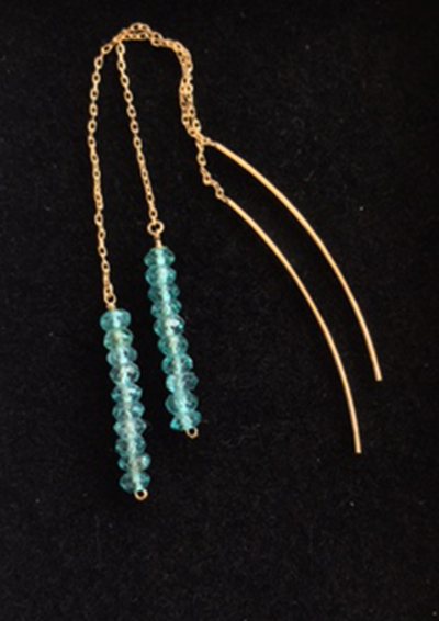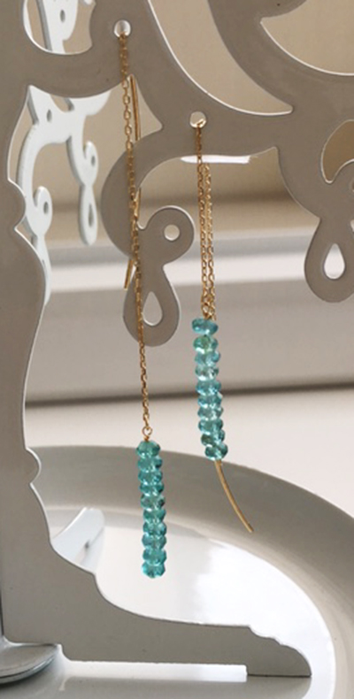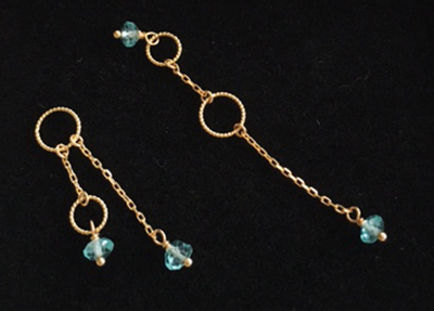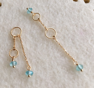 【K18 ブルーアパタイトのプチチャーム】(2個 1セット) ご注文番号 543 11,500円 (+消費税) ※画像にマウスをあてますと、大きなサイズで商品をご覧いただけます。 ☆ブルーアパタイトが2粒と K18パーツを使っているチャームです。 ブルーアパタイトは、横が約3㎜ 縦が約2㎜で繊細なボタンカットが施されています。 チェーンとヨリ線の輪[ロープのようなテクスチャー]を2種類 直径5㎜と直径4㎜の輪を組み合わせたデザインです。 2つのサイズのヨリ線の輪のどちらに ピアスを通していただいてもお使いいただけます。 小さな輪の方に通すと 少し長めの 全長が約3、8㎝になり、大きな輪の方に通すと 全長が約2、7㎝になります。 気分によって長さを変えてみたり 左右をアシンメトリーにしてお楽しみくださいね。 ブルーの輝きが清々しいチャームです。 |