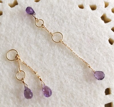 【K18 アメジストのプチチャーム】(2個 1セット) ご注文番号 544 ※画像にマウスをあてますと、大きなサイズで商品をご覧いただけます。 ☆アメジストが2粒と K18パーツを使っているチャームです。 アメジストは、横が約3㎜ 縦が約6㎜で繊細なブリオレットカットが施されています。 チェーンとヨリ線の輪[ロープのようなテクスチャー]を2種類 直径5㎜と直径4㎜の輪を組み合わせたデザインです。 2つのサイズのヨリ線の輪のどちらに ピアスを通していただいてもお使いいただけます。 小さな輪の方に通すと 少し長めの 全長が約4、2㎝になり、大きな輪の方に通すと 全長が約3㎝になります。 気分によって長さを変えてみたり 左右をアシンメトリーにしてお楽しみくださいね。 むらさきが素敵で魅力的なチャームです。 |