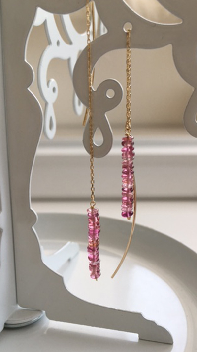 【K10 ピンクトルマリン アメリカンピアス】(ペア1組) ご注文番号 548 10,000円 (+消費税) ※画像にマウスをあてますと、大きなサイズで商品をご覧いただけます。 ・K10イエローゴールド アメリカンカーブピアス ・カーブしたピンの長さ 約3㎝ ・チェーンの長さ 約5㎝ ・チャーム部分の長さ(ピンクトルマリン) 約2㎝ ・全体の長さ 約10㎝ ・K10イエローゴールド マルカン使用 ☆綺麗なピンク色のトルマリンの 細かいディスク状のビーズを使用したチャームです。 ナチュラルカラーのピンクトルマリンは、とても高価な石です。 丸玉ビーズの6㎜位の大きさでも 美しいものであれば 1粒が10000円以上もする稀少な素材のピンクトルマリンです。 透明感がありピンクの発色も良い ナチュラルな小さなビーズを連ねています。 とても可愛らしいですよ。 |