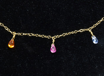 ご注文番号 245 サファイアマルチネックレス(ブリオレット・ナチュラルカラー 宝石質) K18金具使用 スライドボールアジャスター付約43cmまで対応 見ての通り、透明さや優雅さを高めたいとき、外見と内面の両方から美しくなりたいとき、インスピレーションを高めたいとき、目標を 貫きたいときなど、持つ人の意思が強ければ強いほど、しっかりと応援してくれる石です。邪悪なものを遠ざけ、神からの祝福を得られることでしょう。 ※画像にマウスをあてますと、大きなサイズで商品をご覧いただけます。 |